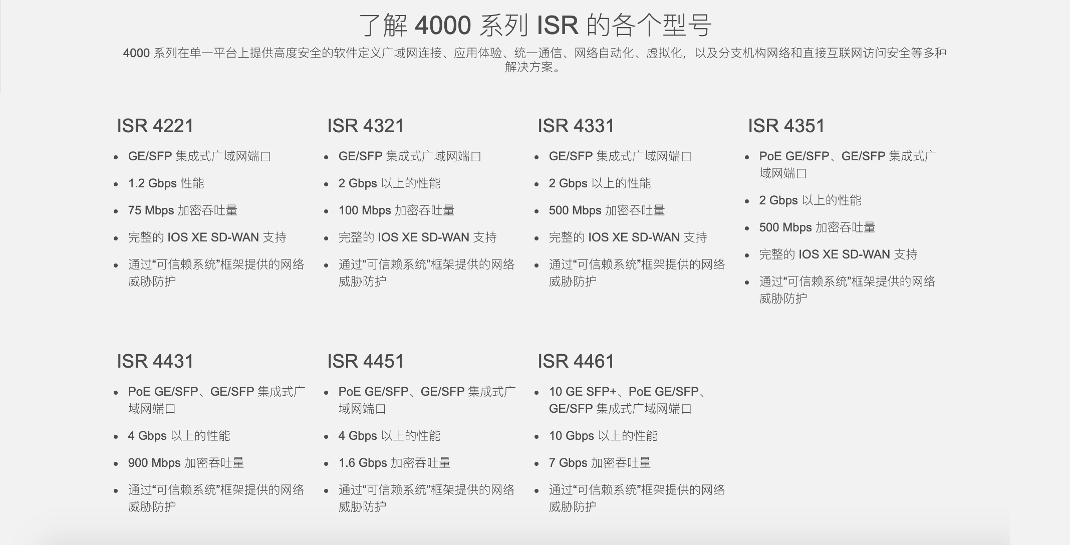 利用思科 4000 系列集成多业务路由器 (ISR) 全数字化就绪型平台,让您的分支机构站点获得保护并面向未来做好准备。简化日常 IT 管理。提供可扩展且灵活的基础,以便您迅速地将软件定义广域网和边缘计算等领先 IT 项目集成到同一个平台,同时满足因采用基于云的应用而带来的网络性能需求的爆炸性增长。